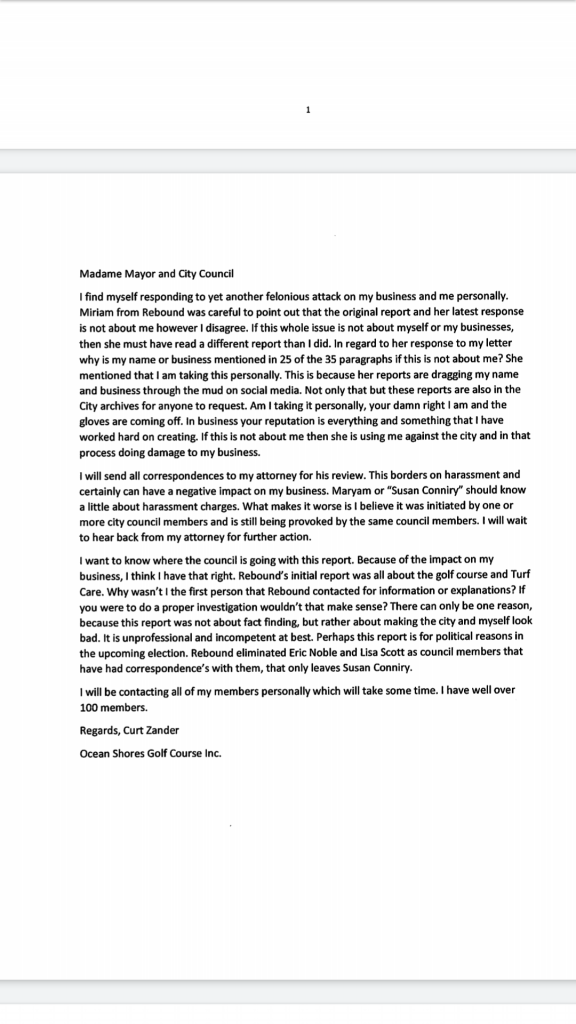 Copy of second post-Rebound report email sent April 21 from Curt Zander, who leases the Ocean Shores, to Mayor Crystal Dingler and Ocean Shores City Council (Zander added, “This is my last correspondence on this matter”:
