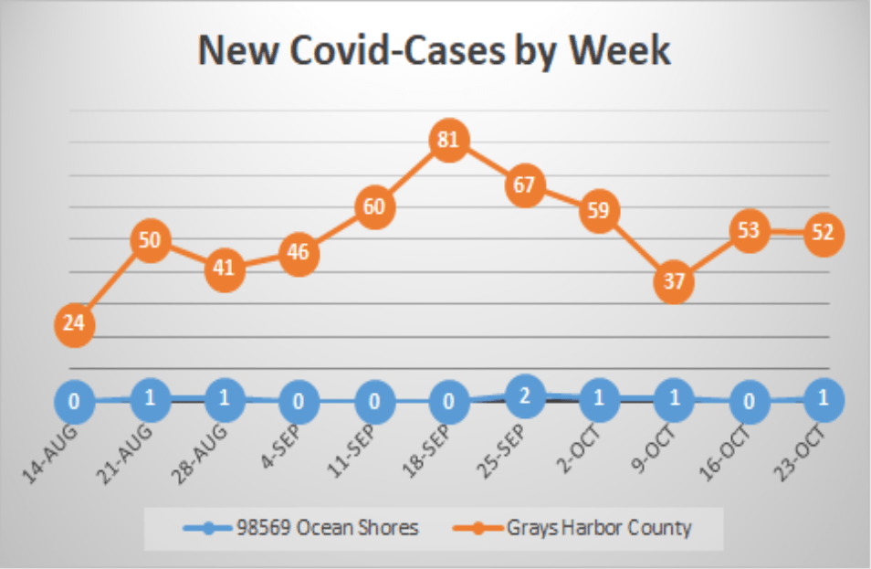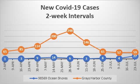 Mayor Crystal Dingler has been diligent about providing COVID updates, which helps put the most recent figures in perspective. While 27 COVID-19 cases in Ocean Shores over a two-week period ending July 23 might not seem alarming, considering the city has a population of around 6,000 — it’s more than a touch concerning, from a recent-history perspective. OS recorded 10 or more COVID cases over two weeks only a handful of times over the last year. From August through October, there were only a total of seven COVID cases reported. The previous high for a two-week period was 14, for the two weeks ending May 14. That fell back over the next reporting periods to six, three, eight and four — before the sudden spike to 27. The likely cause is the Delta variant, which one study showed has a “viral load” of 1,000 times more than the original coronavirus, and thus is much more contagious.