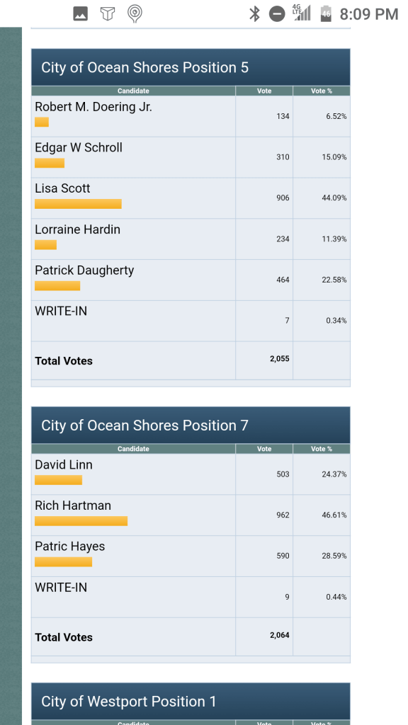 After another 900 OS votes were counted, the two top in the Positions 5 and 7 primaries remain virtual locks to move on to the general election (the primary will be certified Aug. 17). In the 5 race, incumbent Lisa Scott and Patrick Daughtery will move on; Scott’s lead over Daughtery shrank slightly, from 22 points to 19 — but she is still by far the top vote getter, here. On the 7 front, Rich Hartman and Patric Hayes are moving on; Hartman’s lead also shrank slightly, with him going from 46.6% to 45% of the 7 votes and Hayes at just under 30%.