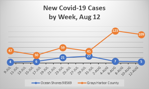 This week, 109 new COVID cases reported in the county — only 5 of those from Ocean Shores residents, according to information forwarded by Mayor Crystal Dingler. After 21 new cases in OS July 23 and 27 new cases here July 31, this continues a downward trend for the city — while cases in the county have shot up over the last two weeks.