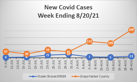 Over the last week, new COVID cases jumped from 109 in Grays Harbor County the week before to 209. In OS, cases increased from 5 the week ending Aug. 13 to 13 the week ending Aug. 20. The OS numbers remain significantly lower than the July 23 (21) and July 31 (27) new COVID cases, according to data provided by Ocean Shores Mayor Crystal Dingler.