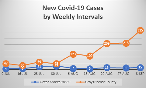 A smaller increase in OS, where COVID reported cases increased from 11 to 15 — but a spike in the county, from 213 cases the week before to 315 the week ending Sept. 3. As elsewhere, the Delta variant seems to be spreading fast …