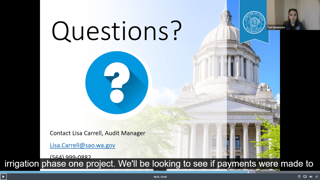 “…irrigation project phase one,” said Tori Umemoto, of the state audit department, at this week’s meeting. And, she added, “Our audit is very focused to respond to citizen concerns.” Any concerns can be emailed to Lisa.Carrell@sao.wa.gov.