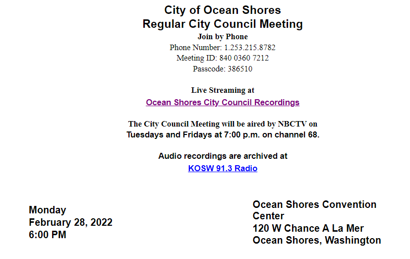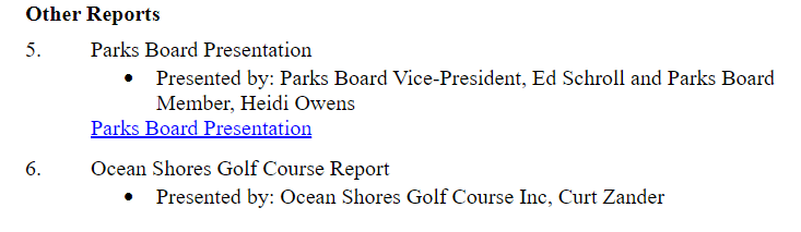 | 6. | Ocean Shores Golf Course Report Presented by: Ocean Shores Golf Course Inc, Curt Zander |
